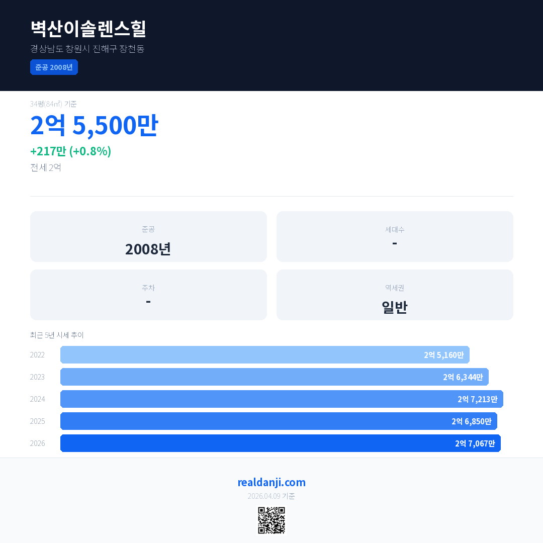 벽산이솔렌스힐 국민평형 기준 2026년 평균 거래가는 2억 7,067만으로, 전년 대비 0.8% 상승 했습니다.