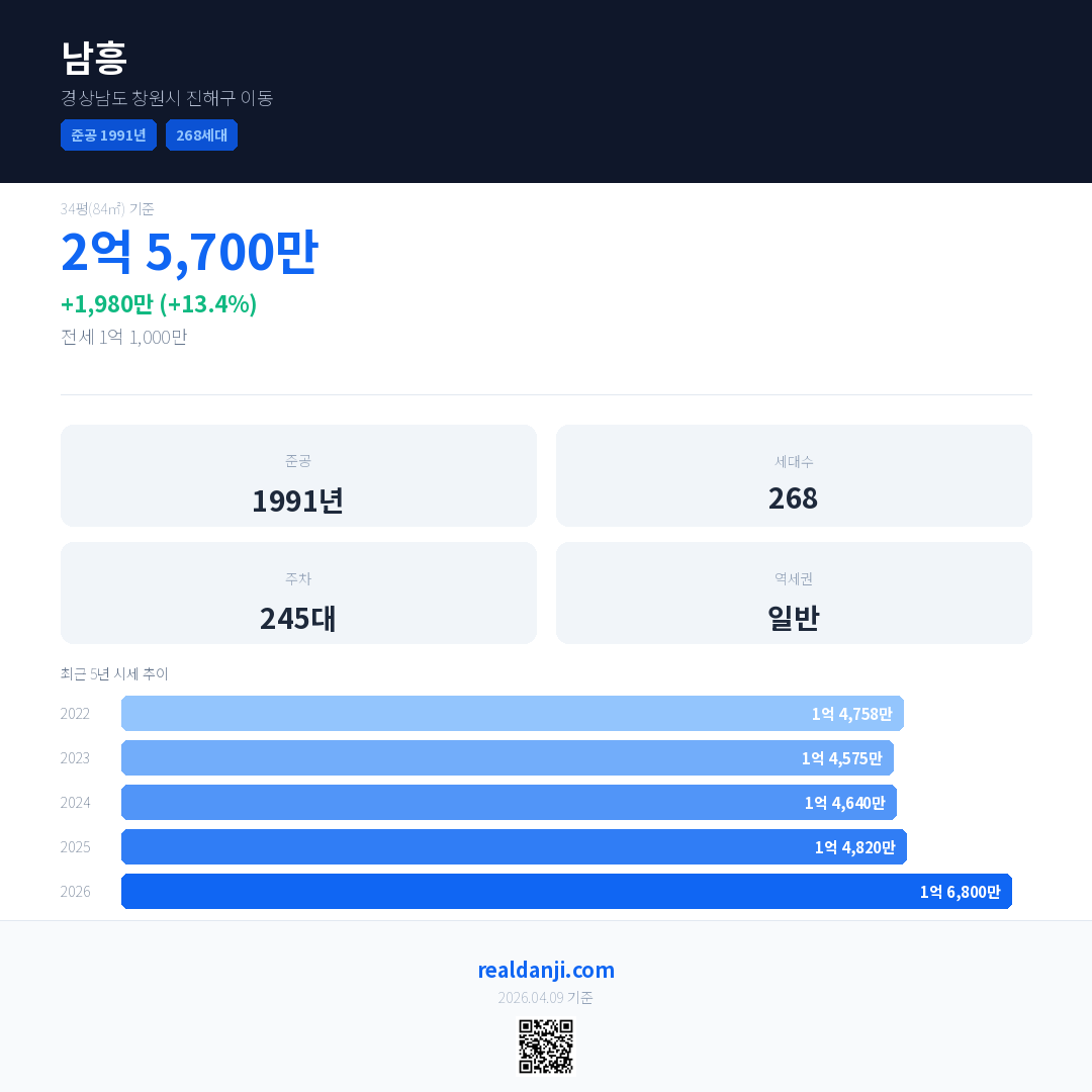 남흥 국민평형 기준 2026년 평균 거래가는 1억 6,800만으로, 전년 대비 13.4% 상승 했습니다.