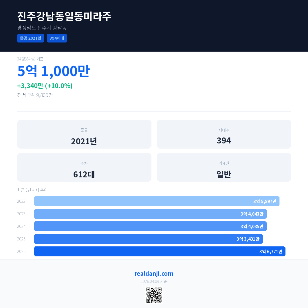 진주강남동일동미라주 국민평형 기준 2026년 평균 거래가는 3억 6,771만으로, 전년 대비 10.0% 상승 했습니다.