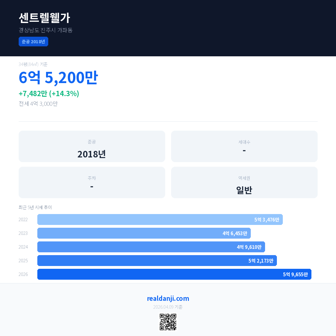 센트렐웰가 국민평형 기준 2026년 평균 거래가는 5억 9,655만으로, 전년 대비 14.3% 상승 했습니다.
