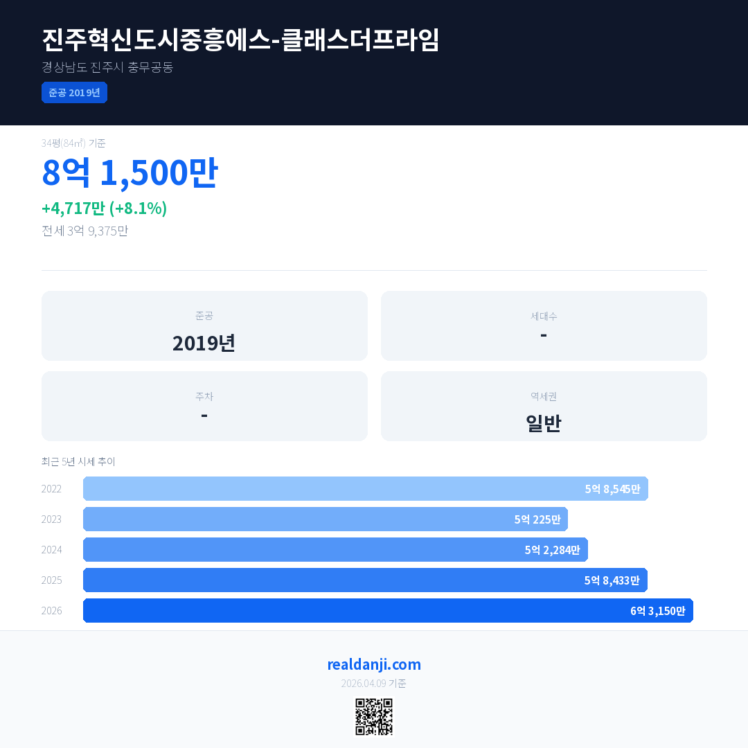진주혁신도시중흥에스-클래스더프라임 최근 거래가는 8억 1,500만입니다. (2026-03)