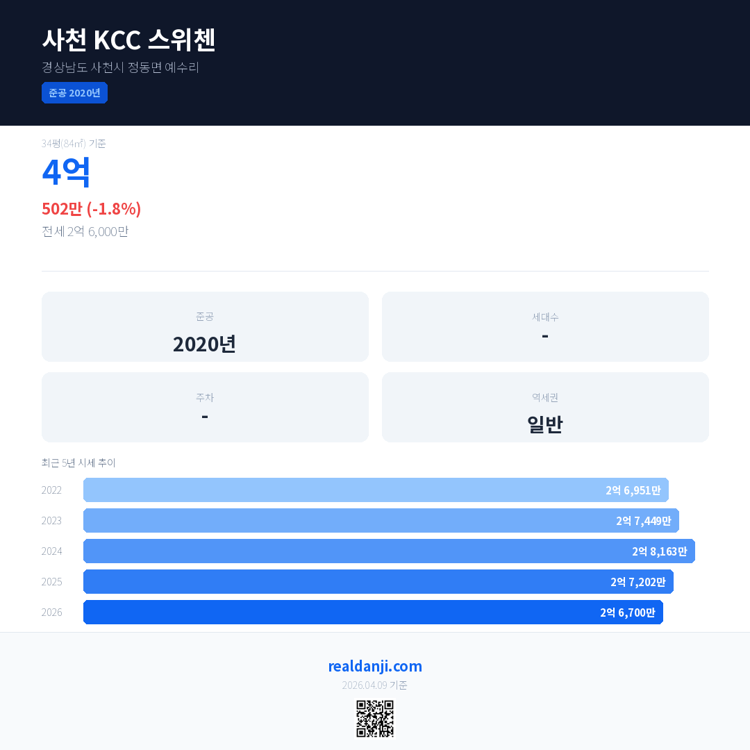 사천 KCC 스위첸은(는) 2020년에 준공되었으며, 현재 6년차입니다.