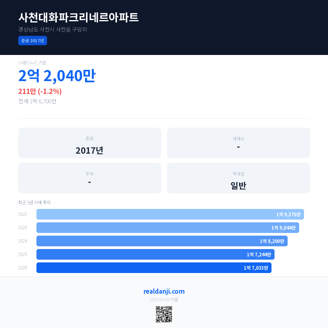 사천대화파크리네르아파트 최근 거래가는 2억 2,040만입니다. (2026-03)
