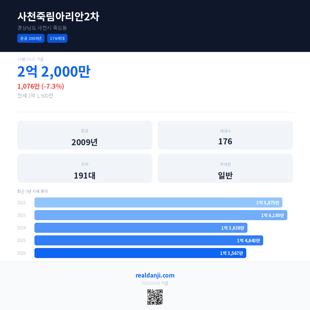 사천죽림아리안2차 최근 거래가는 2억 2,000만입니다. (2026-02)
