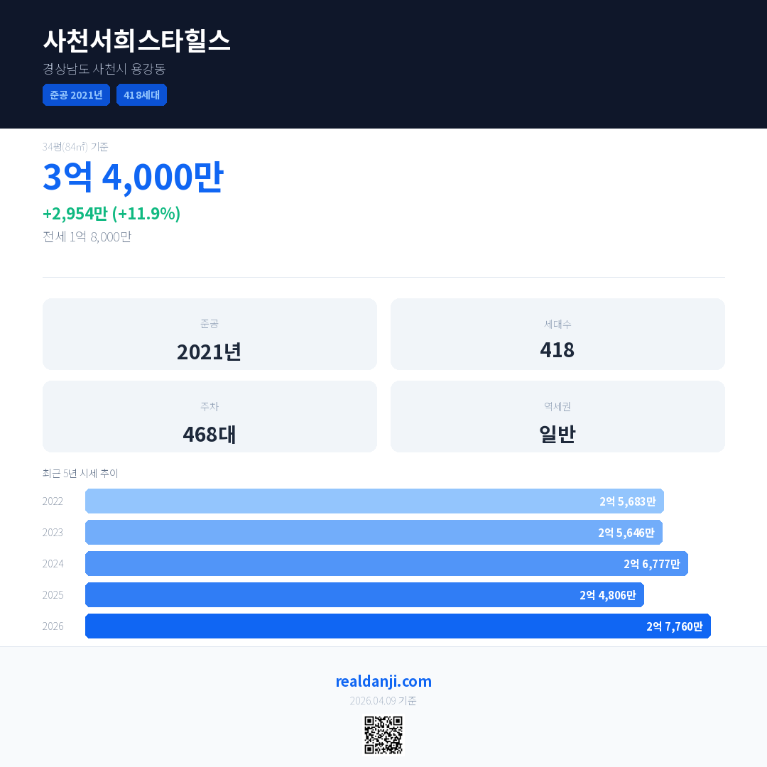 사천서희스타힐스은(는) 2021년에 준공되었으며, 현재 5년차입니다. 총 418세대 규모입니다.