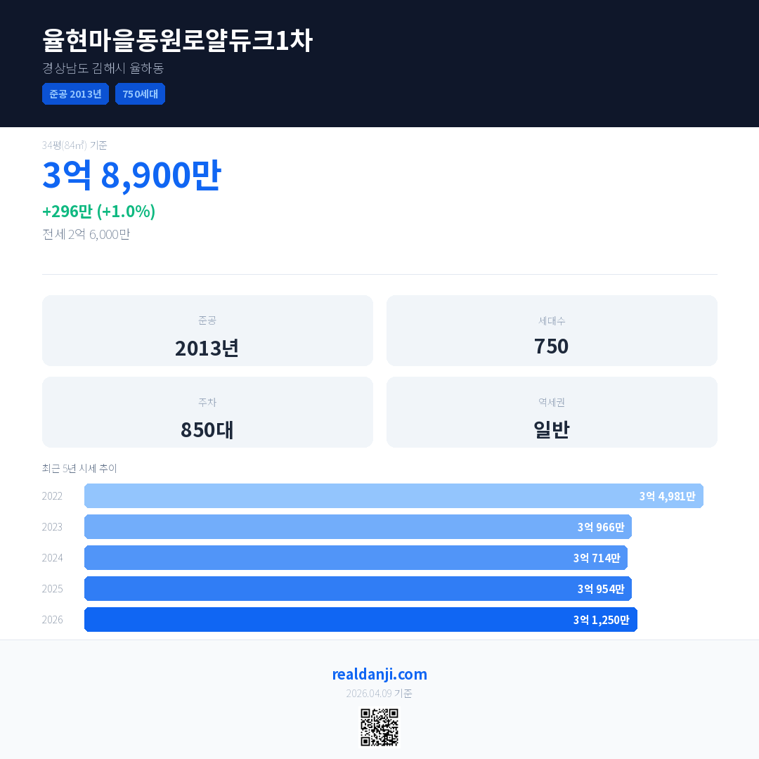 율현마을동원로얄듀크1차 최근 거래가는 3억 8,900만입니다. (2026-04)