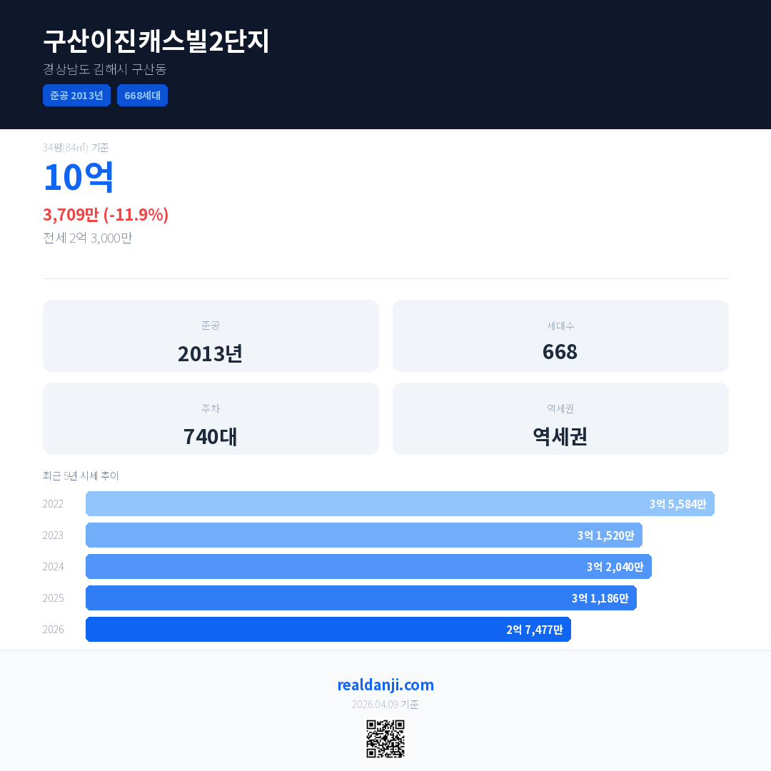 구산이진캐스빌2단지은(는) 2013년에 준공되었으며, 현재 13년차입니다. 총 668세대 규모입니다.