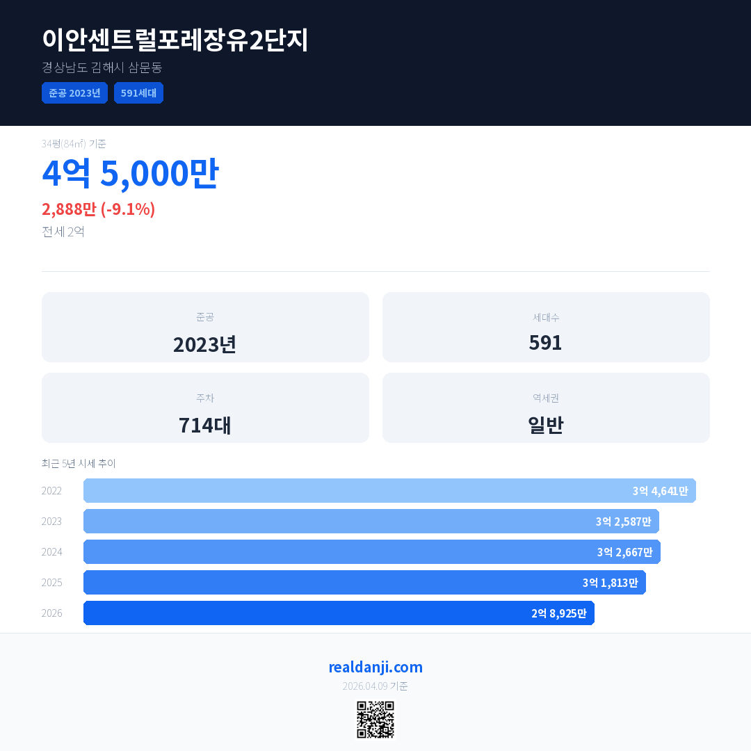 이안센트럴포레장유2단지 최근 거래가는 4억 5,000만입니다. (2026-03)