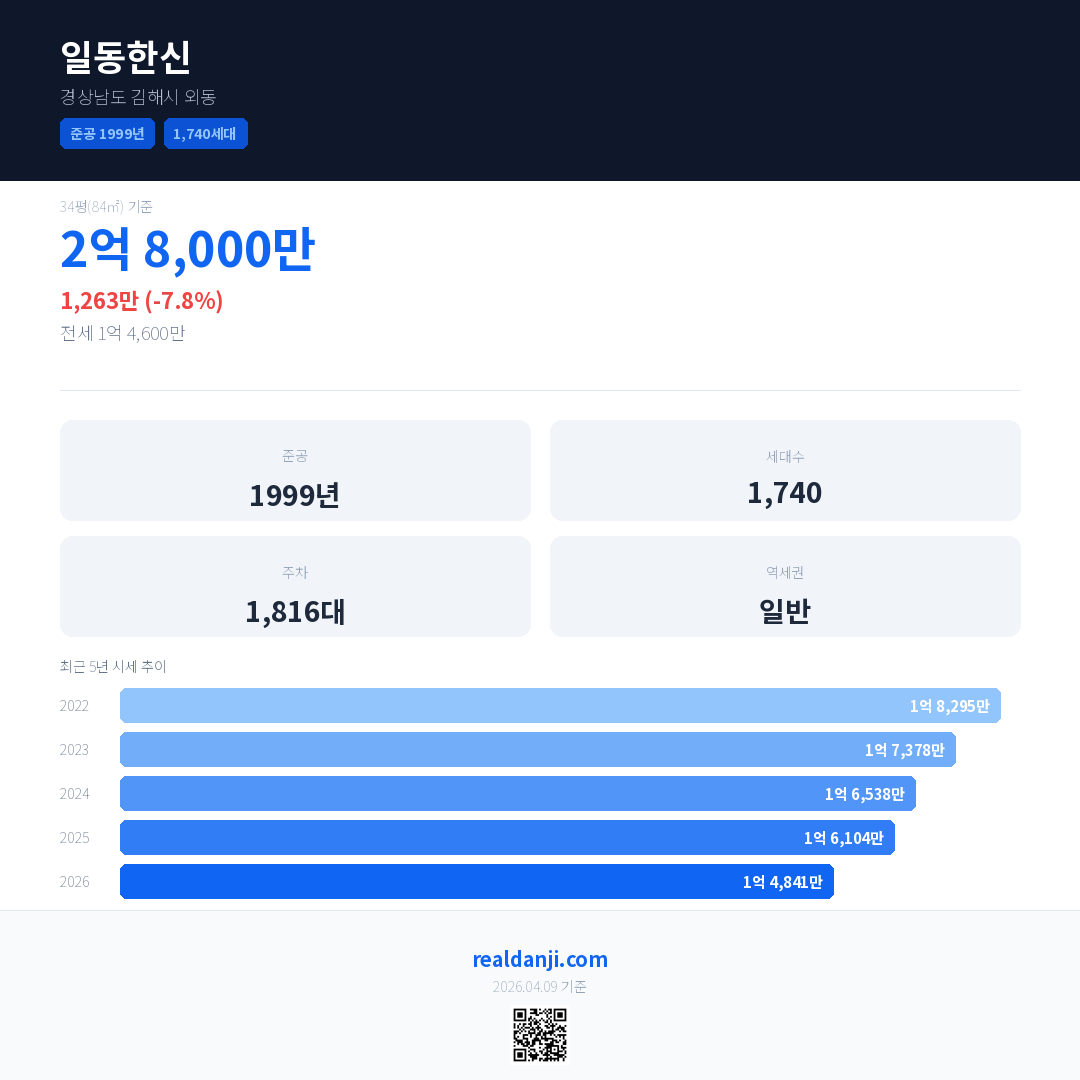 일동한신 국민평형 기준 2026년 평균 거래가는 1억 4,841만으로, 전년 대비 7.8% 하락 했습니다.