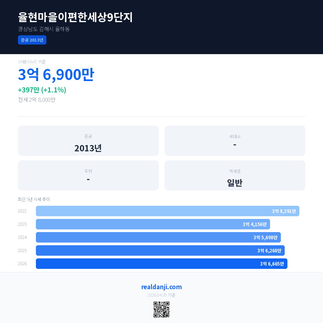 율현마을이편한세상9단지 국민평형 기준 2026년 평균 거래가는 3억 6,658만으로, 전년 대비 1.1% 상승 했습니다.