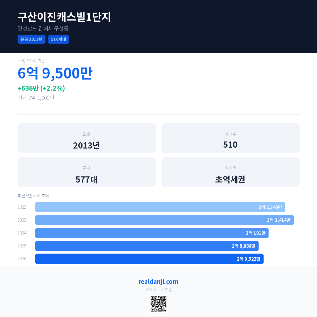 구산이진캐스빌1단지 최근 거래가는 6억 9,500만입니다. (2026-03)