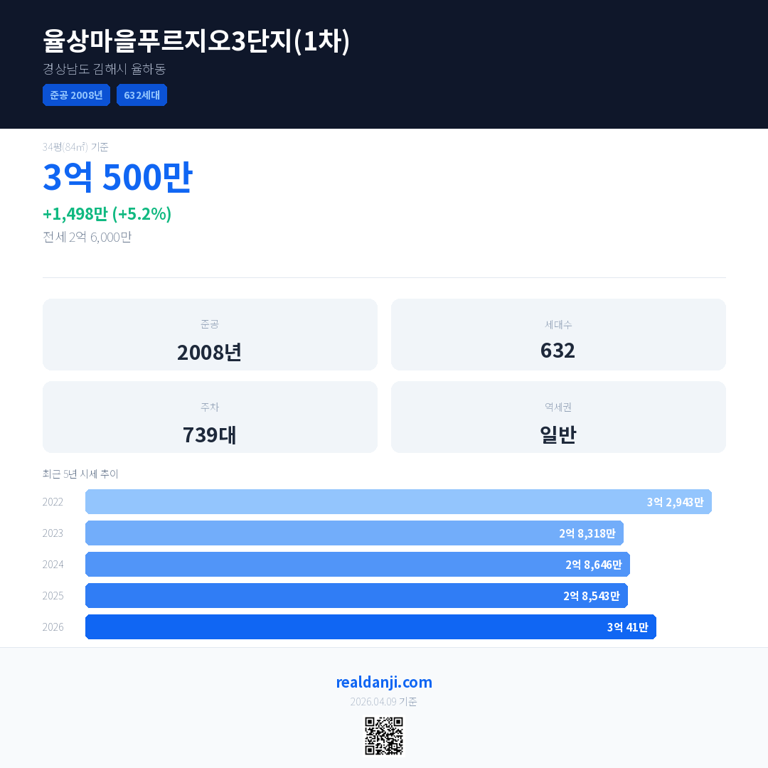 율상마을푸르지오3단지(1차) 국민평형 기준 2026년 평균 거래가는 3억 41만으로, 전년 대비 5.2% 상승 했습니다.