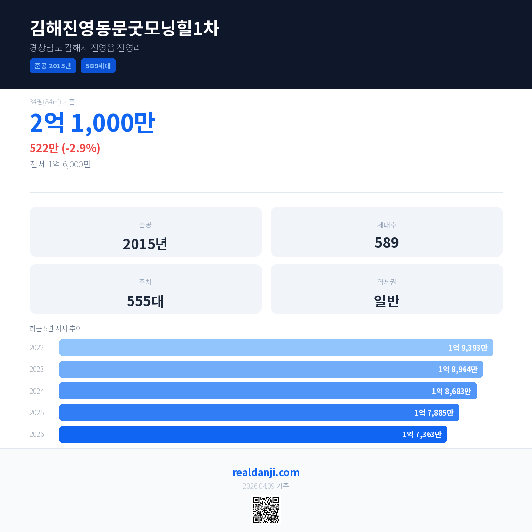 김해진영동문굿모닝힐1차 최근 거래가는 2억 1,000만입니다. (2026-04)