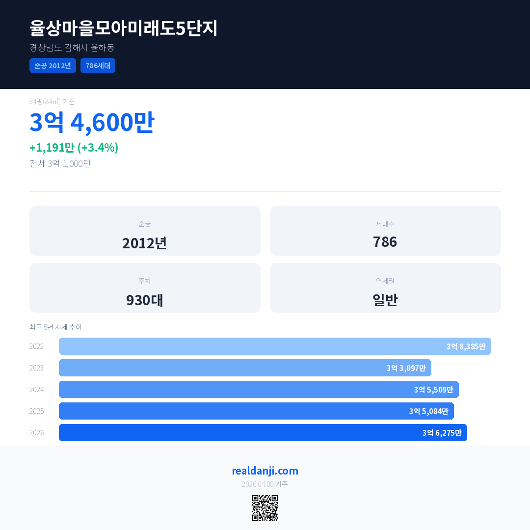 율상마을모아미래도5단지 국민평형 기준 2026년 평균 거래가는 3억 6,275만으로, 전년 대비 3.4% 상승 했습니다.