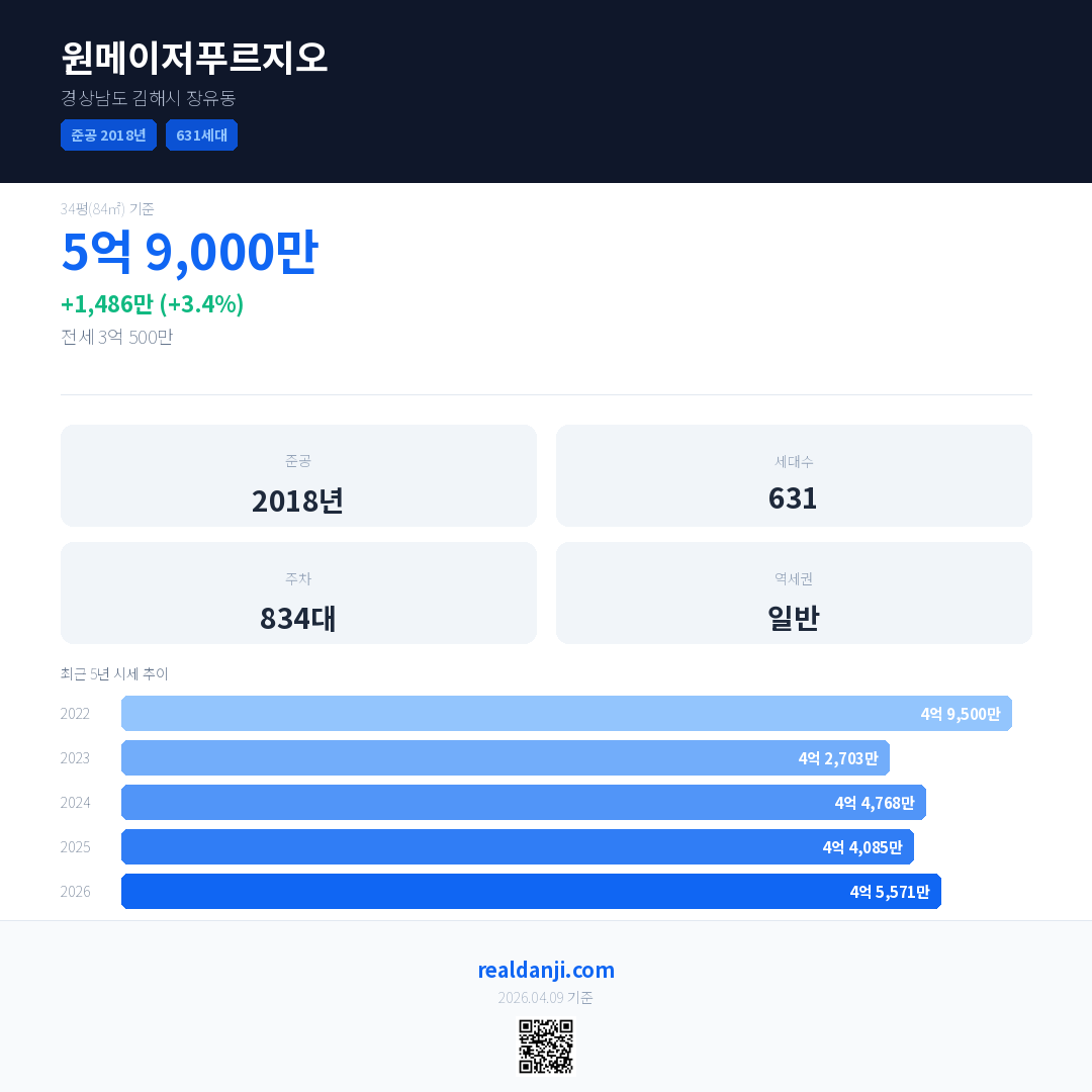 원메이저푸르지오 국민평형 기준 2026년 평균 거래가는 4억 5,571만으로, 전년 대비 3.4% 상승 했습니다.
