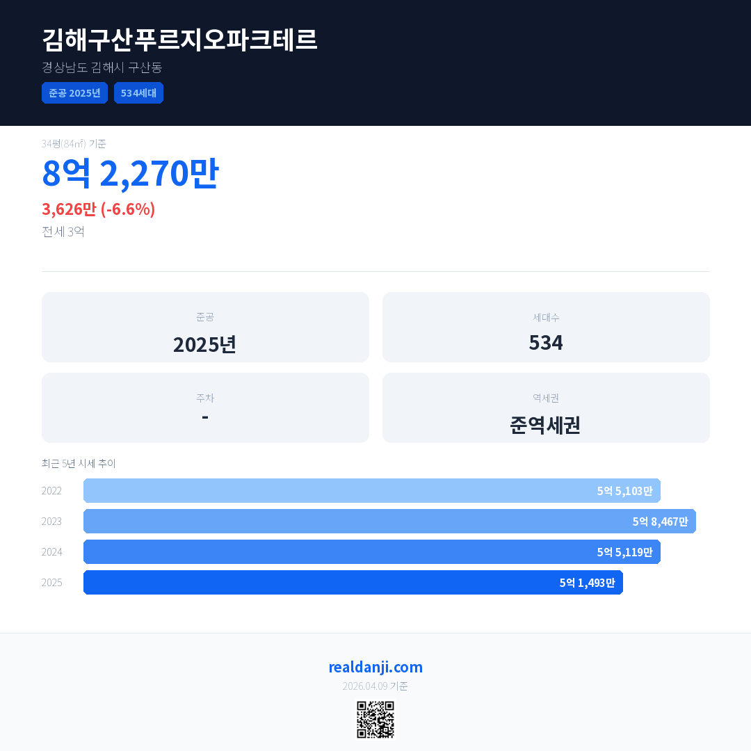 김해구산푸르지오파크테르 국민평형 기준 2025년 평균 거래가는 5억 1,493만으로, 전년 대비 6.6% 하락 했습니다.