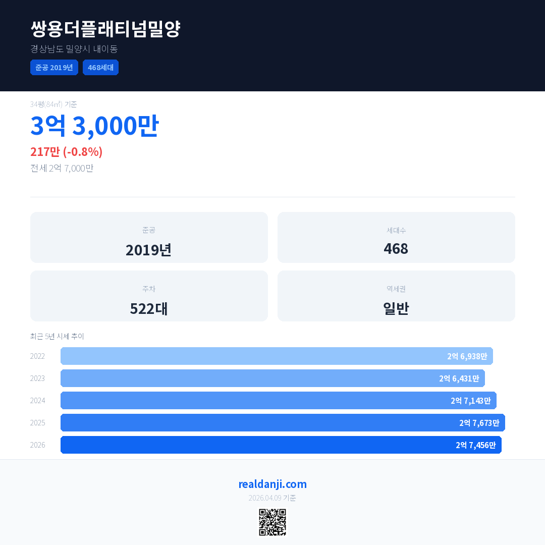 쌍용더플래티넘밀양 국민평형 기준 2026년 평균 거래가는 2억 7,456만으로, 전년 대비 0.8% 하락 했습니다.