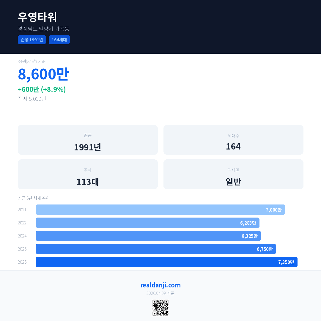 우영타워 국민평형 기준 2026년 평균 거래가는 7,350만으로, 전년 대비 8.9% 상승 했습니다.