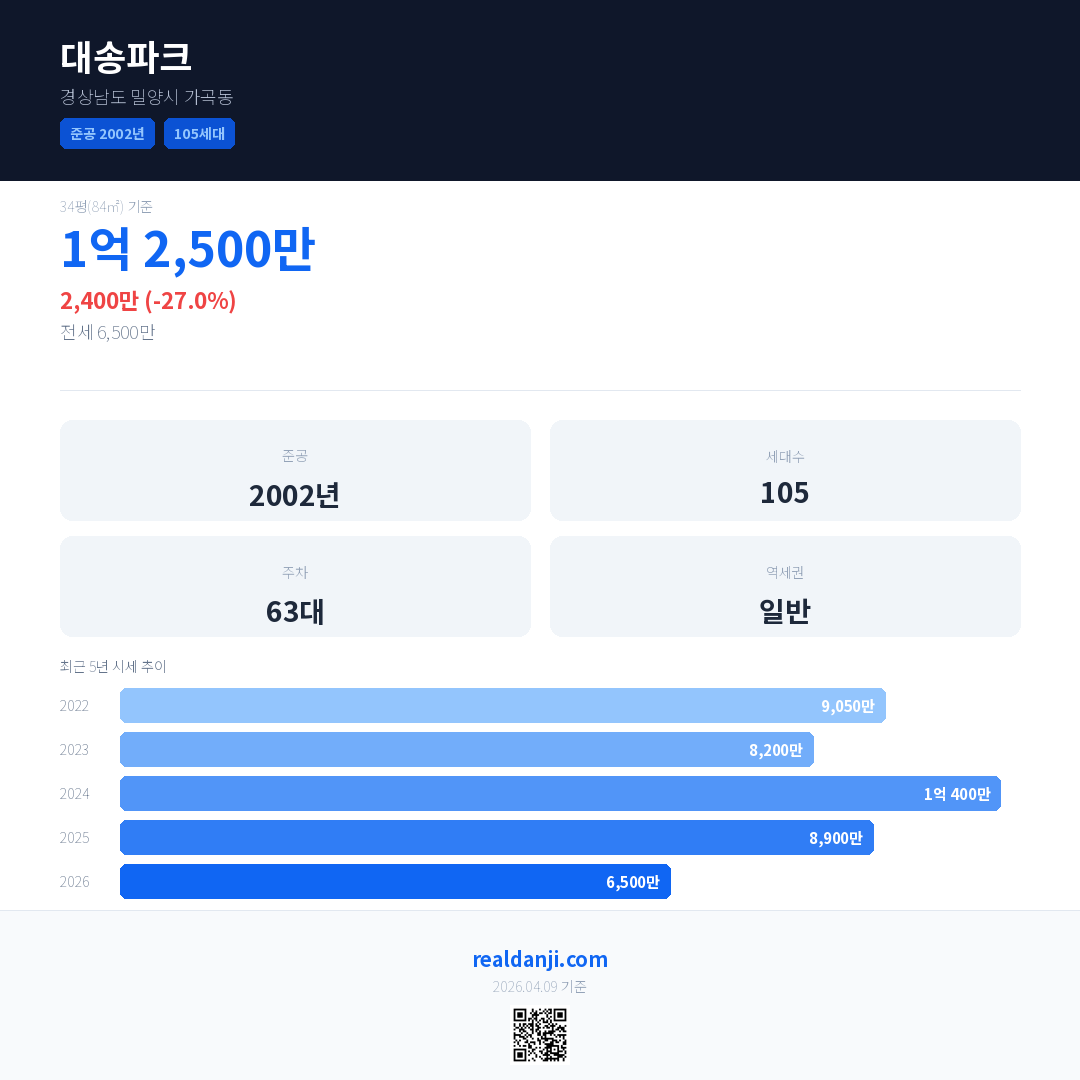 대송파크 국민평형 기준 2026년 평균 거래가는 6,500만으로, 전년 대비 27.0% 하락 했습니다.