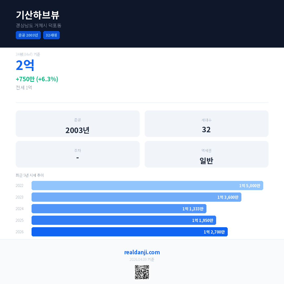 기산하브뷰 국민평형 기준 2026년 평균 거래가는 1억 2,700만으로, 전년 대비 6.3% 상승 했습니다.