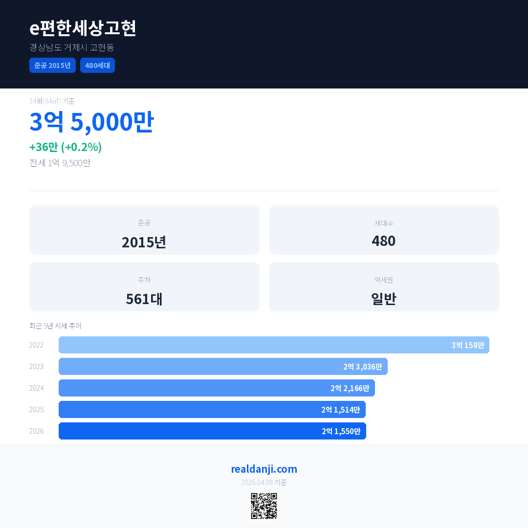 e편한세상고현은(는) 2015년에 준공되었으며, 현재 11년차입니다. 총 480세대 규모입니다.