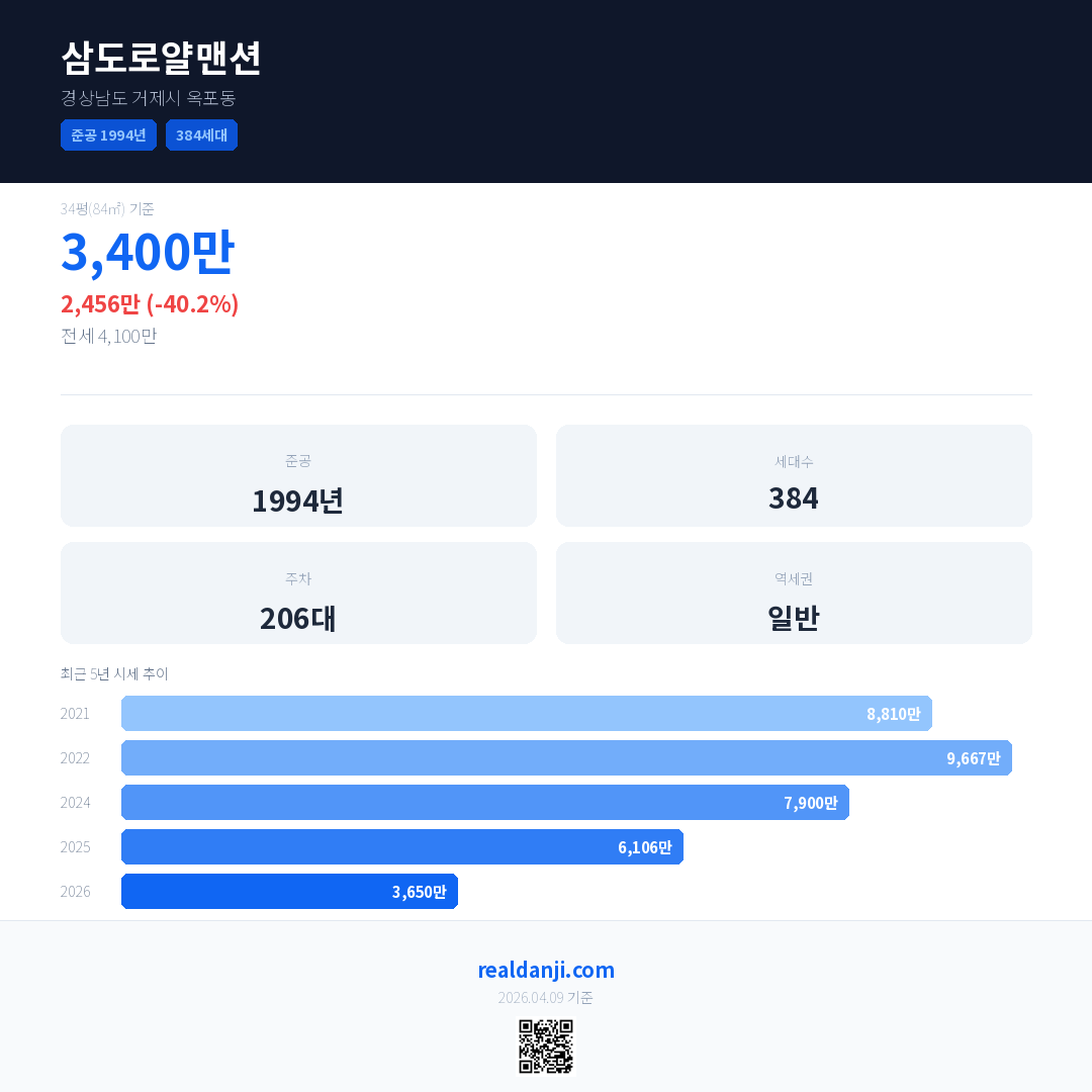 삼도로얄맨션 국민평형 기준 2026년 평균 거래가는 3,650만으로, 전년 대비 40.2% 하락 했습니다.