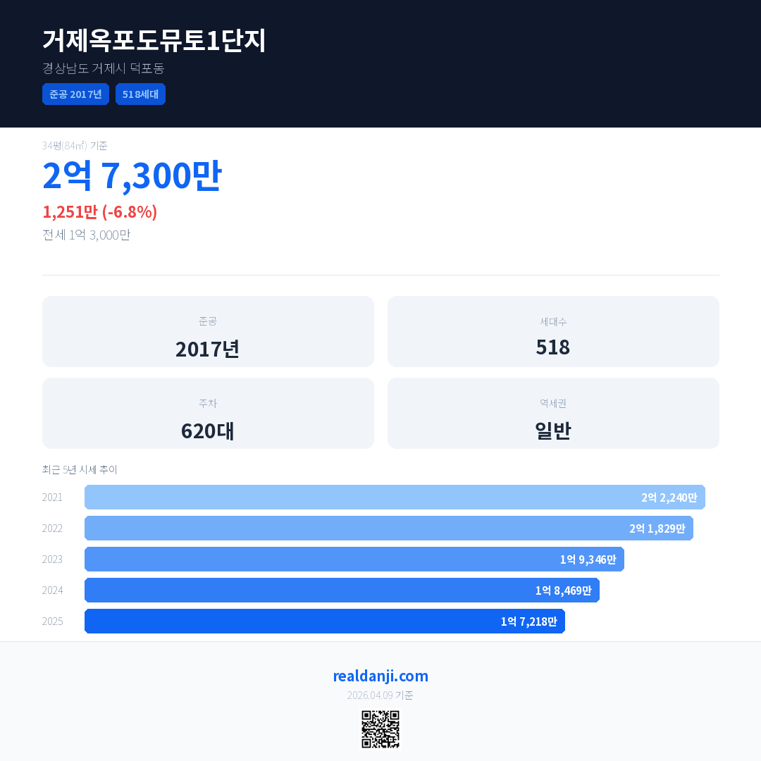 거제옥포도뮤토1단지 국민평형 기준 2025년 평균 거래가는 1억 7,218만으로, 전년 대비 6.8% 하락 했습니다.