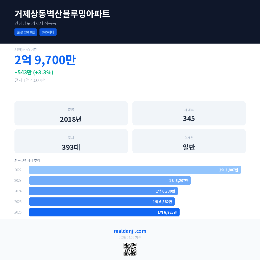 거제상동벽산블루밍아파트 국민평형 기준 2026년 평균 거래가는 1억 6,925만으로, 전년 대비 3.3% 상승 했습니다.