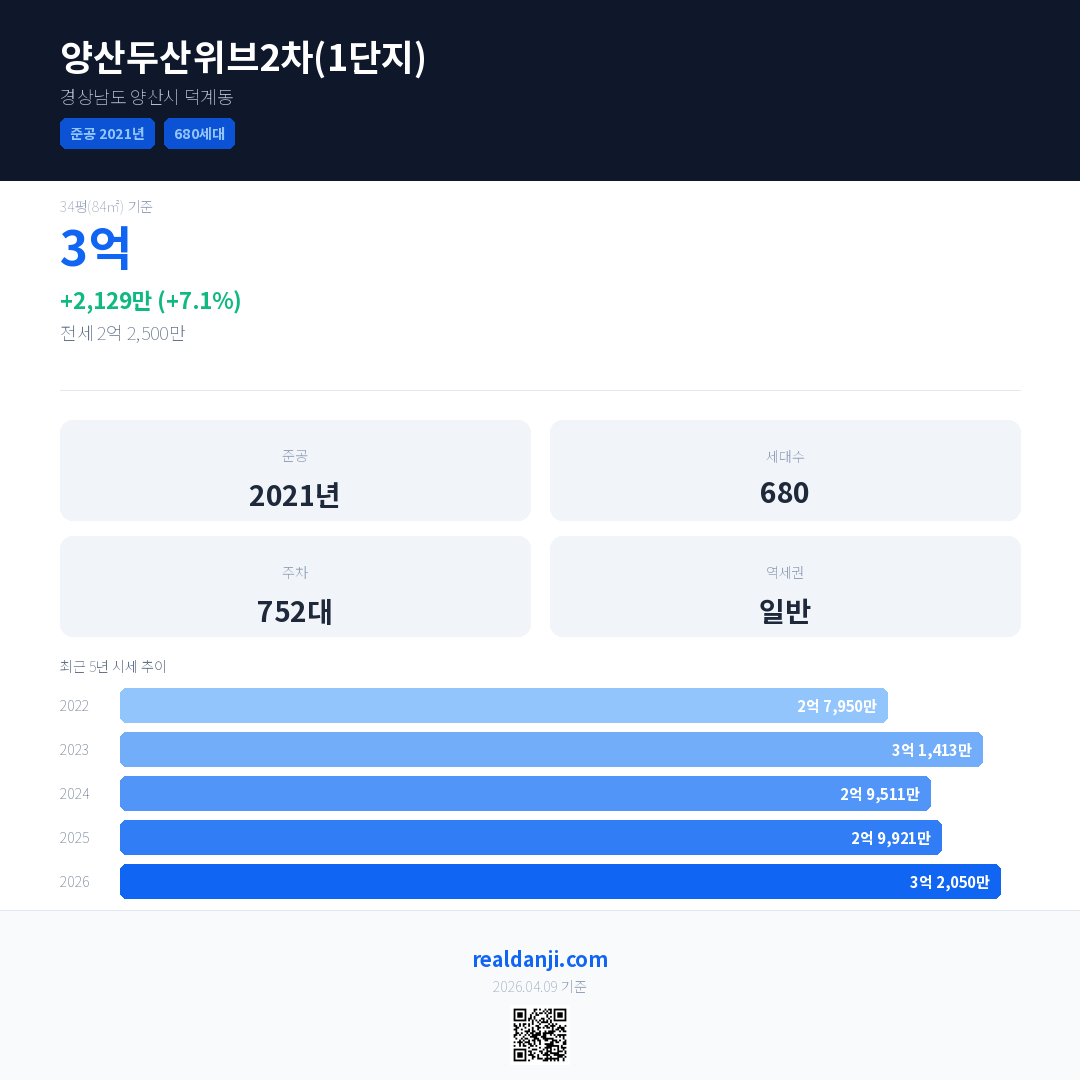 양산두산위브2차(1단지) 국민평형 기준 2026년 평균 거래가는 3억 2,050만으로, 전년 대비 7.1% 상승 했습니다.