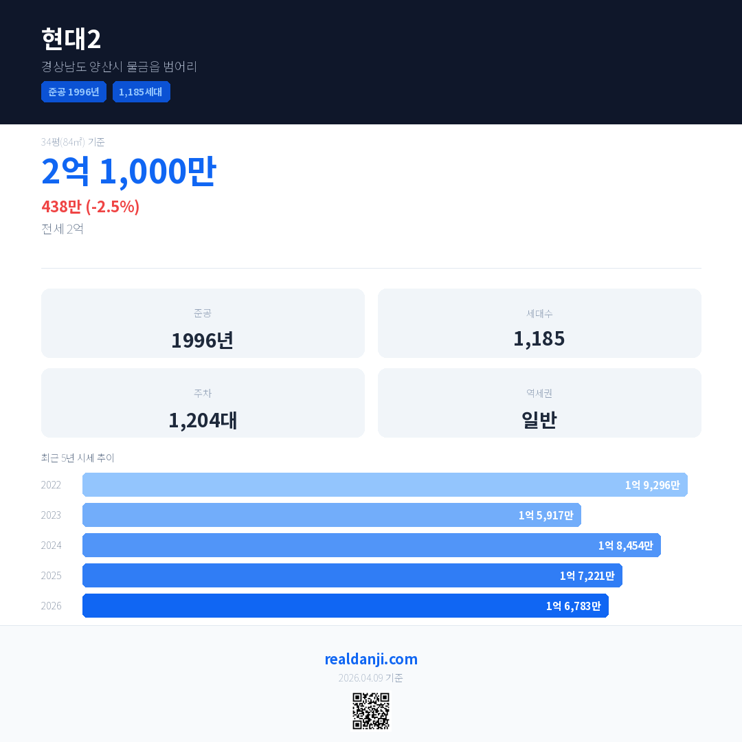 현대2은(는) 1996년에 준공되었으며, 현재 30년차입니다. 총 1,185세대 규모입니다.