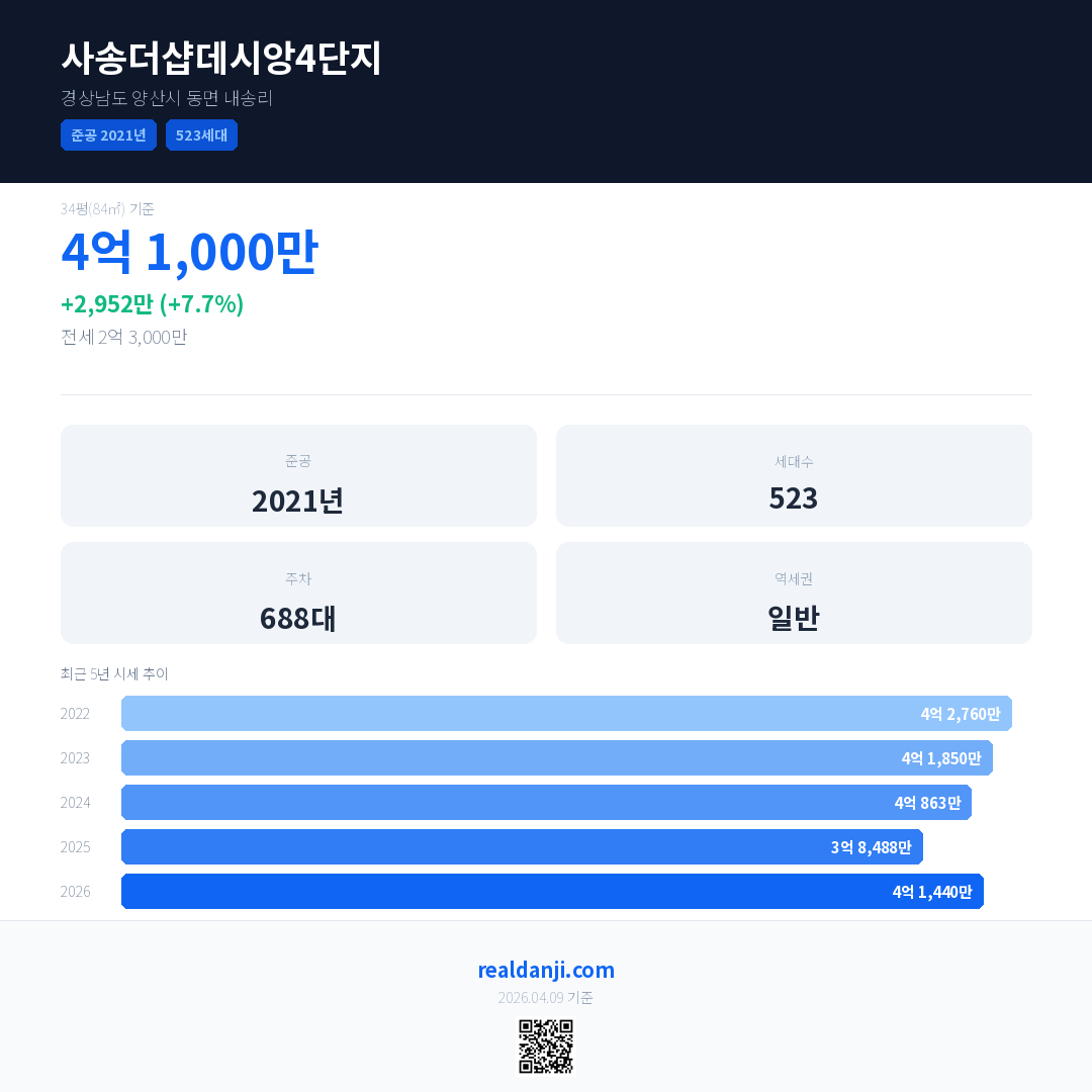 사송더샵데시앙4단지 국민평형 기준 2026년 평균 거래가는 4억 1,440만으로, 전년 대비 7.7% 상승 했습니다.
