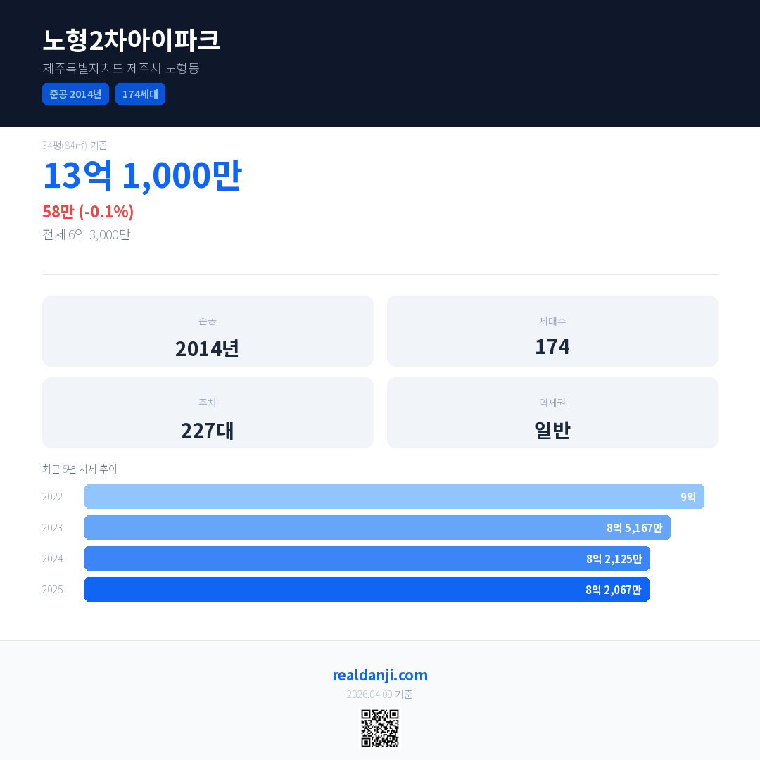 노형2차아이파크 국민평형 기준 2025년 평균 거래가는 8억 2,067만으로, 전년 대비 0.1% 하락 했습니다.