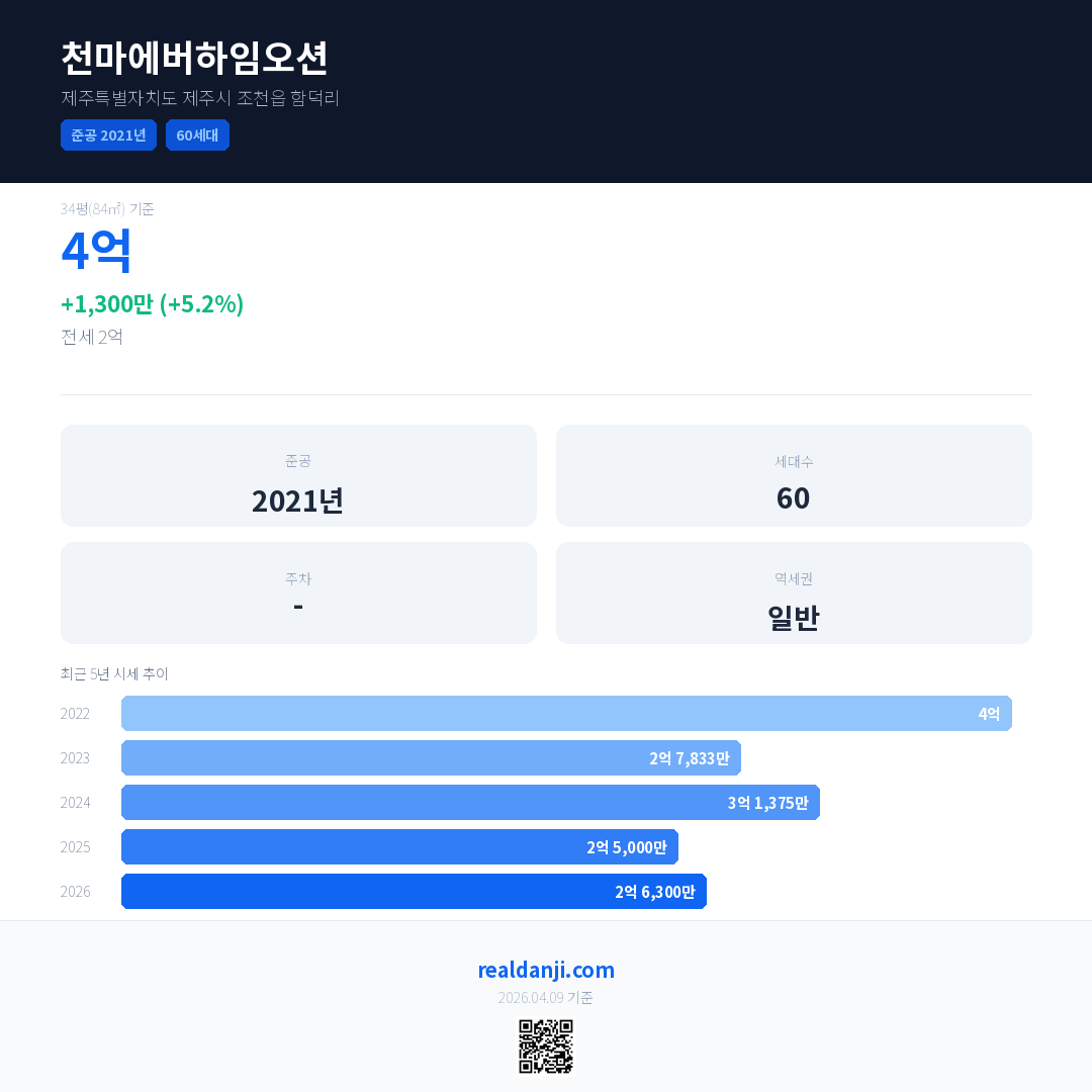 천마에버하임오션 최근 거래가는 4억입니다. (2026-02)