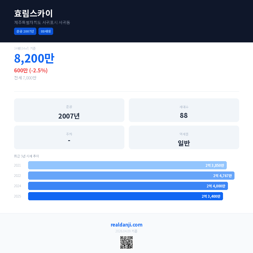 효림스카이 국민평형 기준 2025년 평균 거래가는 2억 3,400만으로, 전년 대비 2.5% 하락 했습니다.