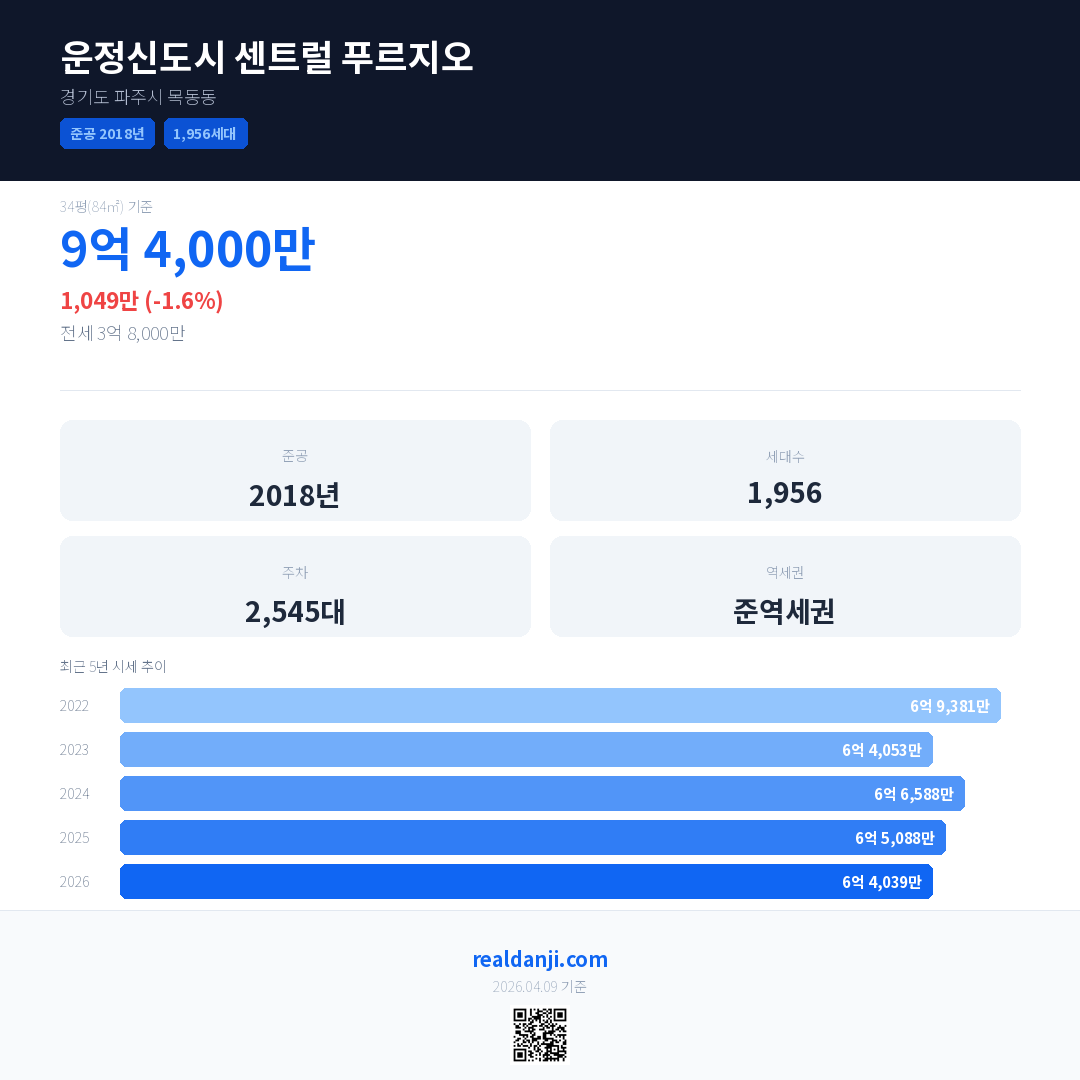 운정신도시 센트럴 푸르지오은(는) 2018년에 준공되었으며, 현재 8년차입니다. 총 1,956세대 규모입니다.