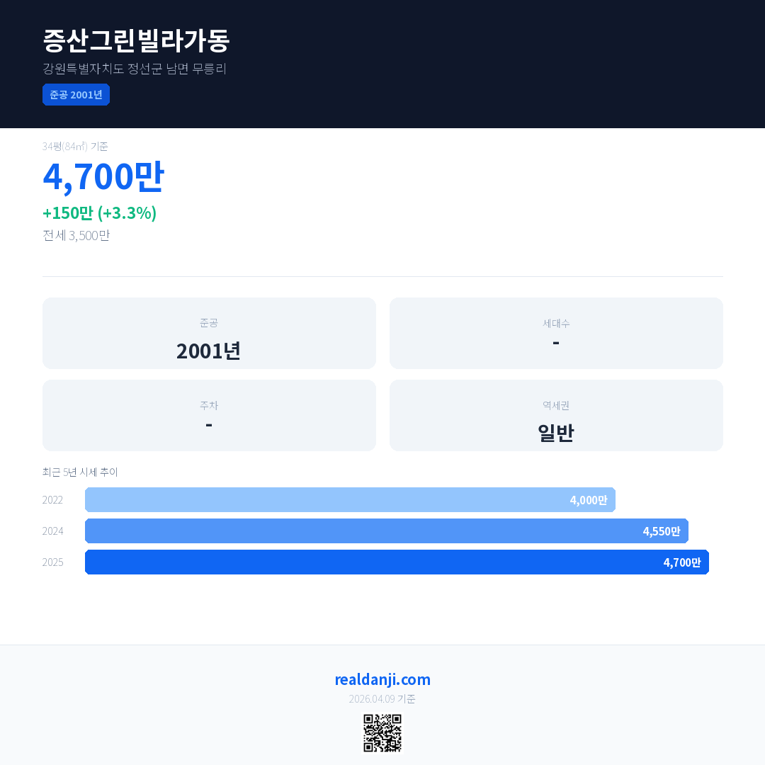 증산그린빌라가동 국민평형 기준 2025년 평균 거래가는 4,700만으로, 전년 대비 3.3% 상승 했습니다.