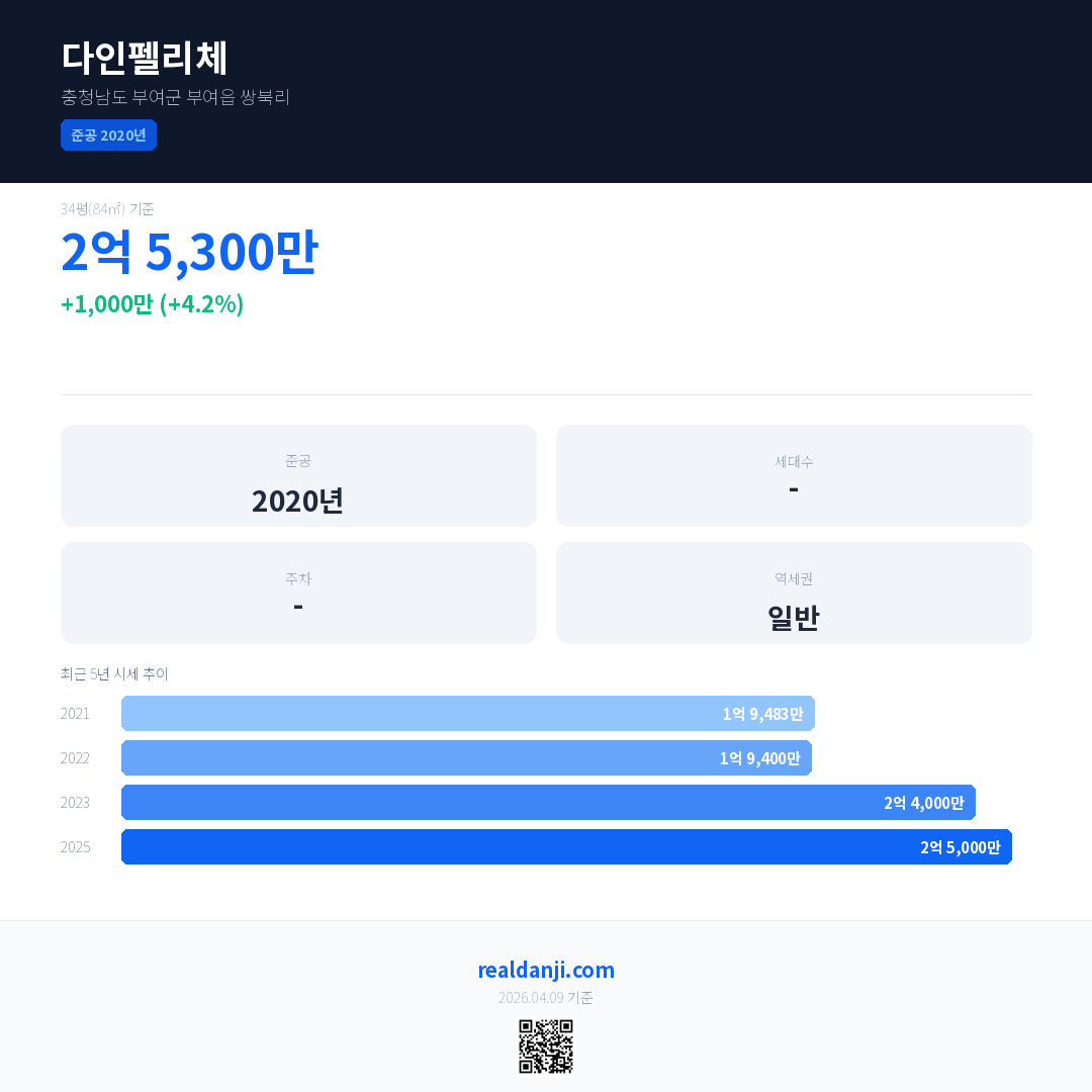 다인펠리체 국민평형 기준 2025년 평균 거래가는 2억 5,000만으로, 전년 대비 4.2% 상승 했습니다.