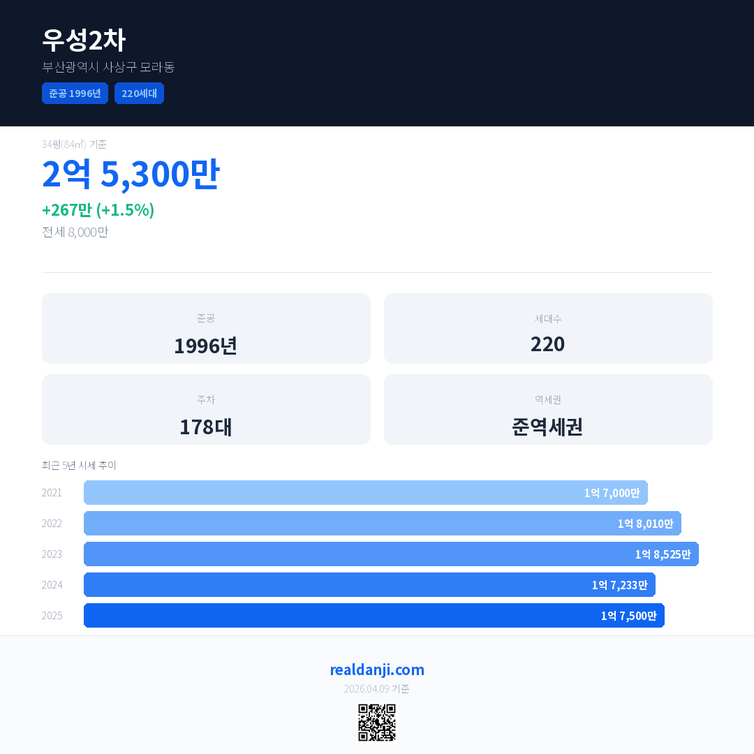 우성2차 국민평형 기준 2025년 평균 거래가는 1억 7,500만으로, 전년 대비 1.5% 상승 했습니다.