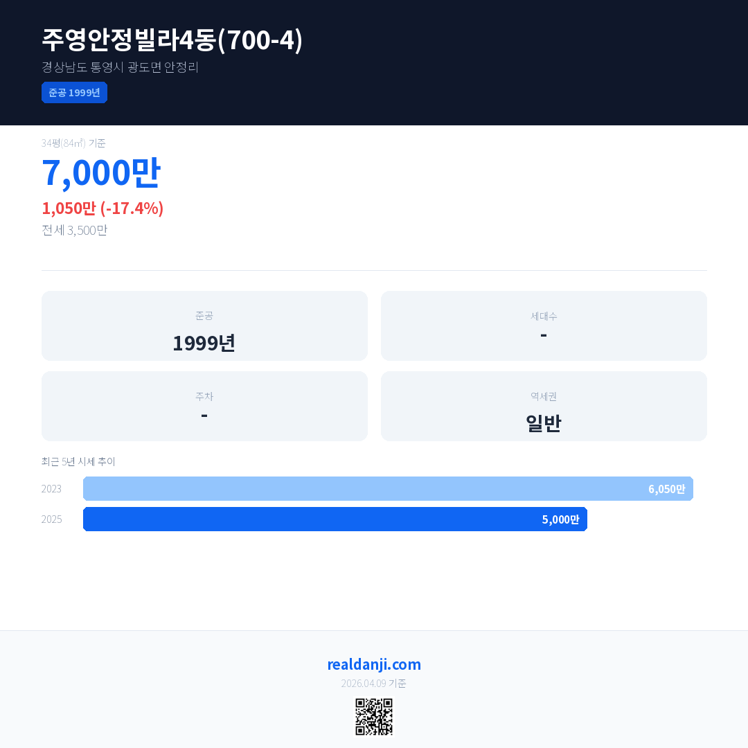 주영안정빌라4동(700-4) 최근 거래가는 7,000만입니다. (2025-09)