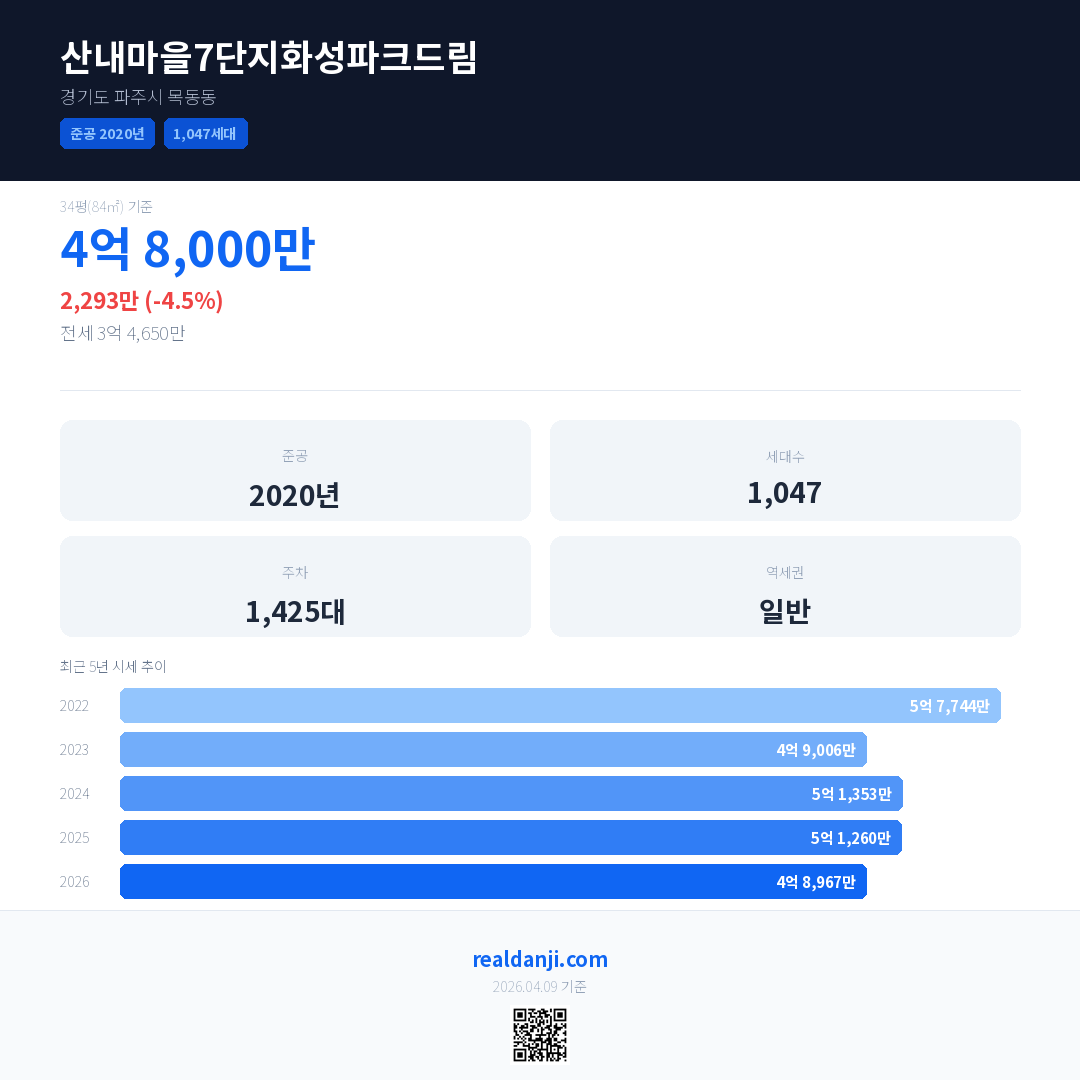 산내마을7단지화성파크드림 국민평형 기준 2026년 평균 거래가는 4억 8,967만으로, 전년 대비 4.5% 하락 했습니다.
