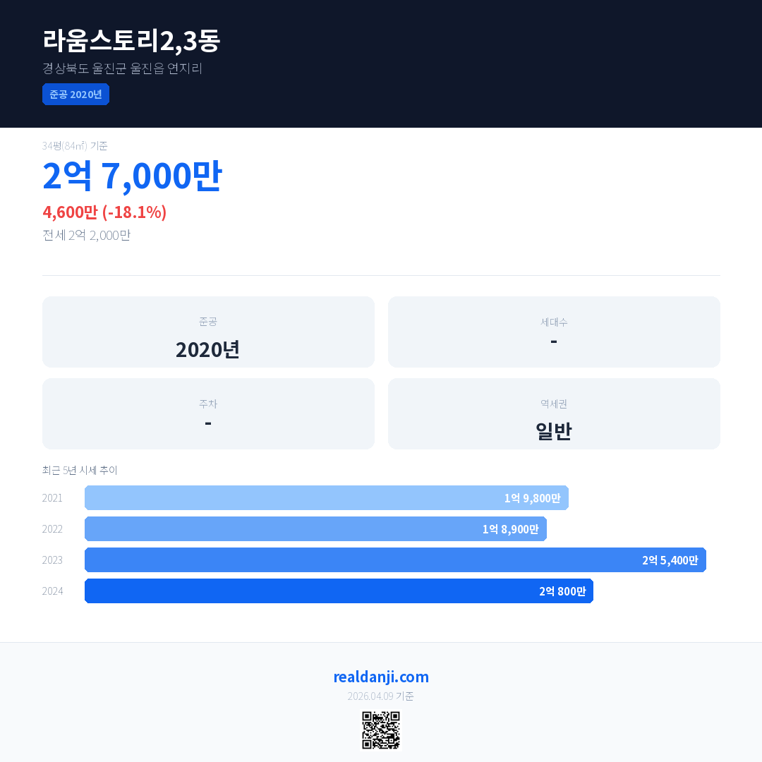 라움스토리2,3동 최근 거래가는 2억 7,000만입니다. (2024-03)