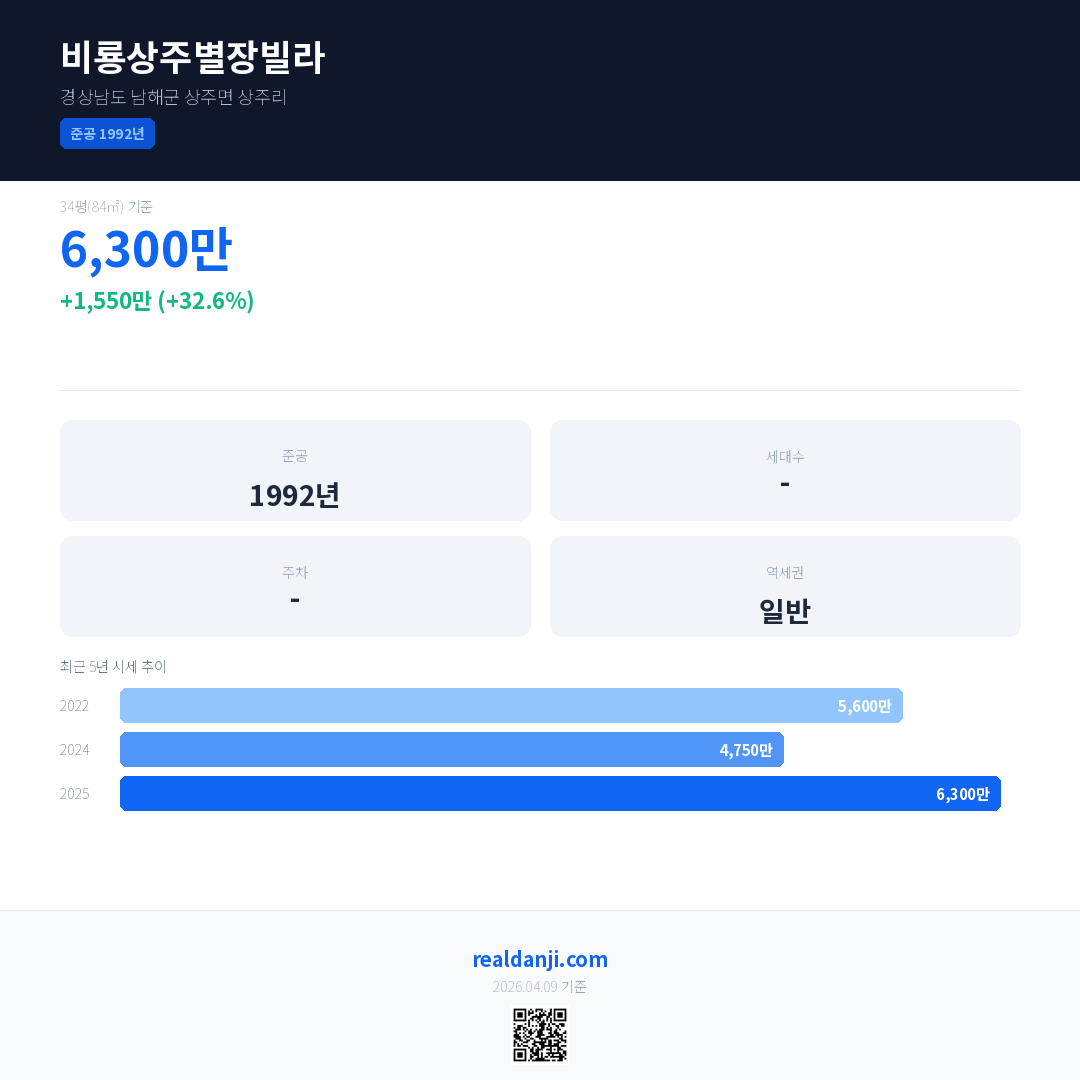 비룡상주별장빌라 국민평형 기준 2025년 평균 거래가는 6,300만으로, 전년 대비 32.6% 상승 했습니다.