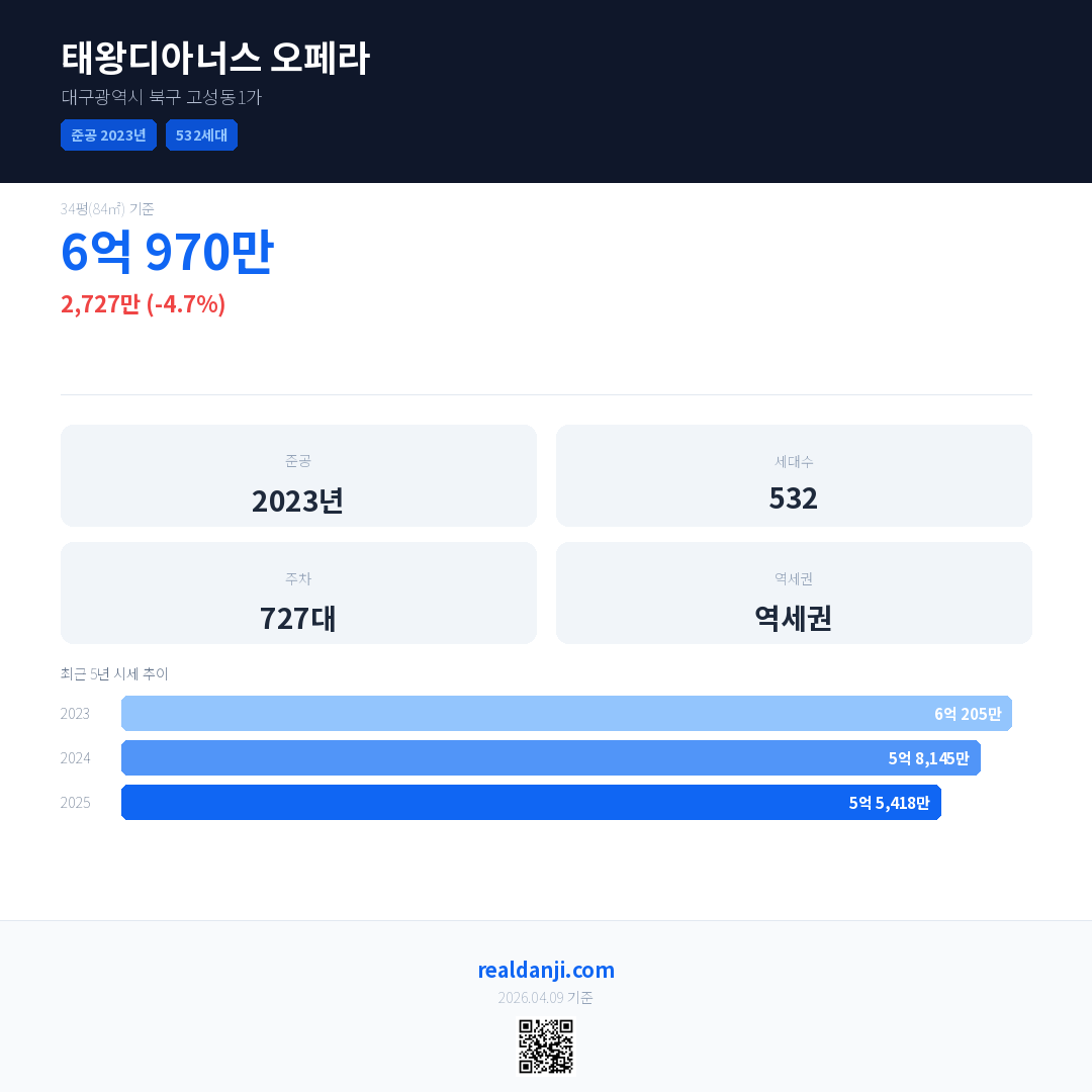 태왕디아너스 오페라 국민평형 기준 2025년 평균 거래가는 5억 5,418만으로, 전년 대비 4.7% 하락 했습니다.