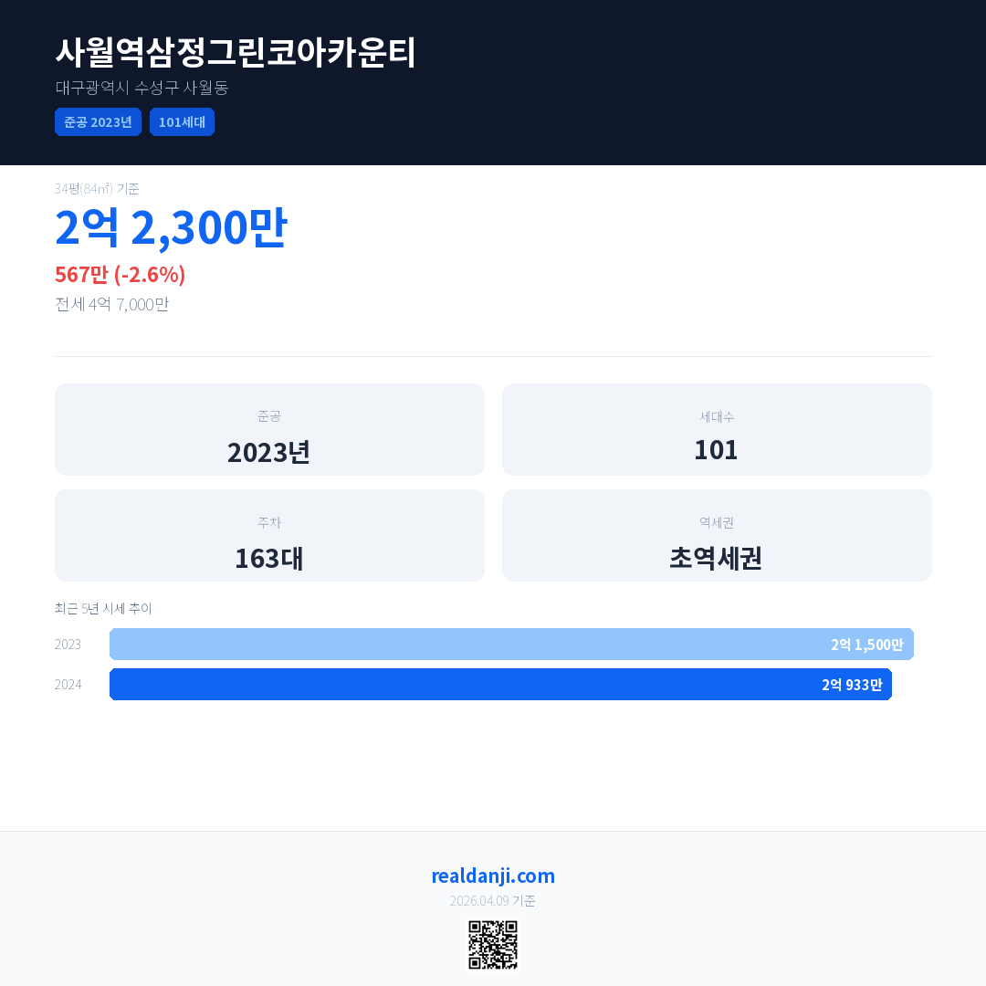 사월역삼정그린코아카운티 국민평형 기준 2024년 평균 거래가는 2억 933만으로, 전년 대비 2.6% 하락 했습니다.