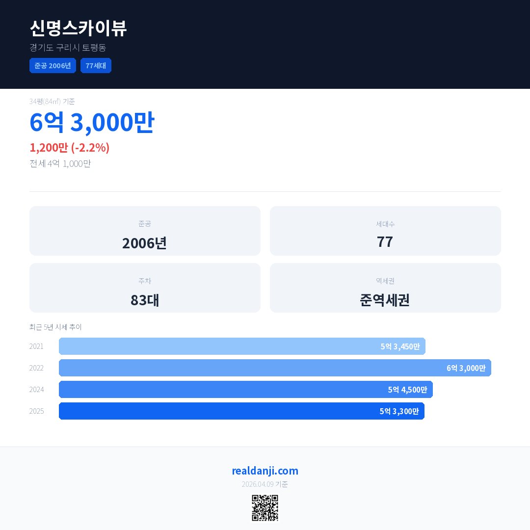 신명스카이뷰 국민평형 기준 2025년 평균 거래가는 5억 3,300만으로, 전년 대비 2.2% 하락 했습니다.