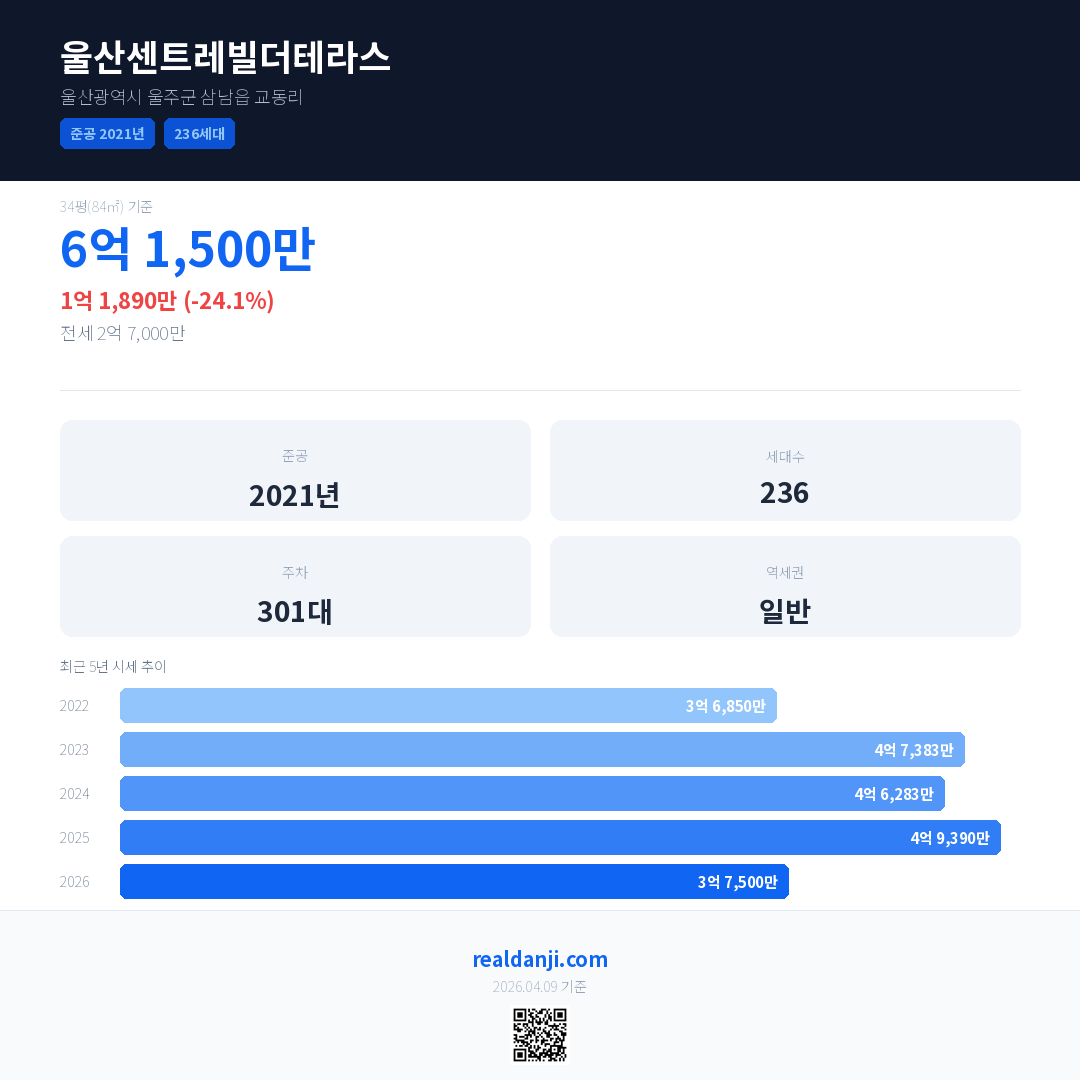 울산센트레빌더테라스 최근 거래가는 6억 1,500만입니다. (2026-02)