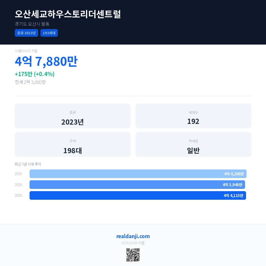 오산세교하우스토리더센트럴 국민평형 기준 2026년 평균 거래가는 4억 4,115만으로, 전년 대비 0.4% 상승 했습니다.
