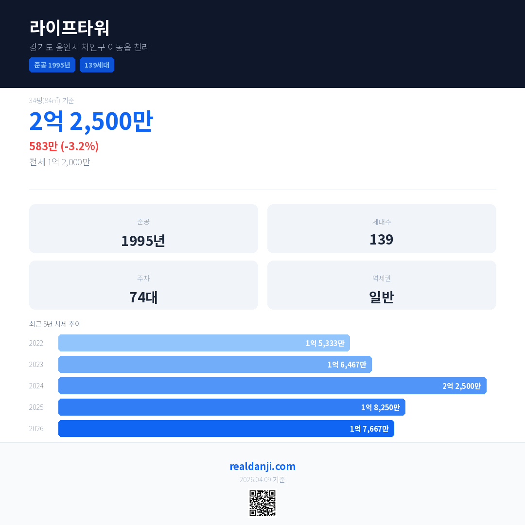 라이프타워 국민평형 기준 2026년 평균 거래가는 1억 7,667만으로, 전년 대비 3.2% 하락 했습니다.