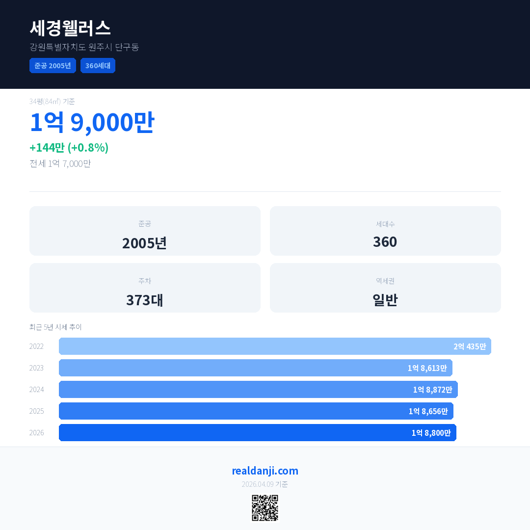 세경웰러스 국민평형 기준 2026년 평균 거래가는 1억 8,800만으로, 전년 대비 0.8% 상승 했습니다.