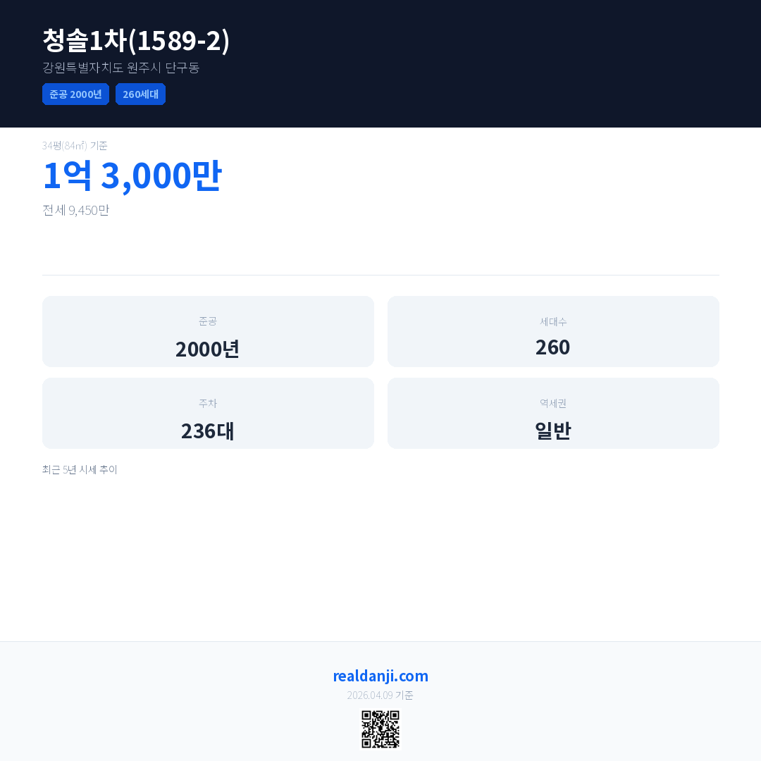 청솔1차(1589-2) 최근 거래가는 1억입니다. (2026-03)